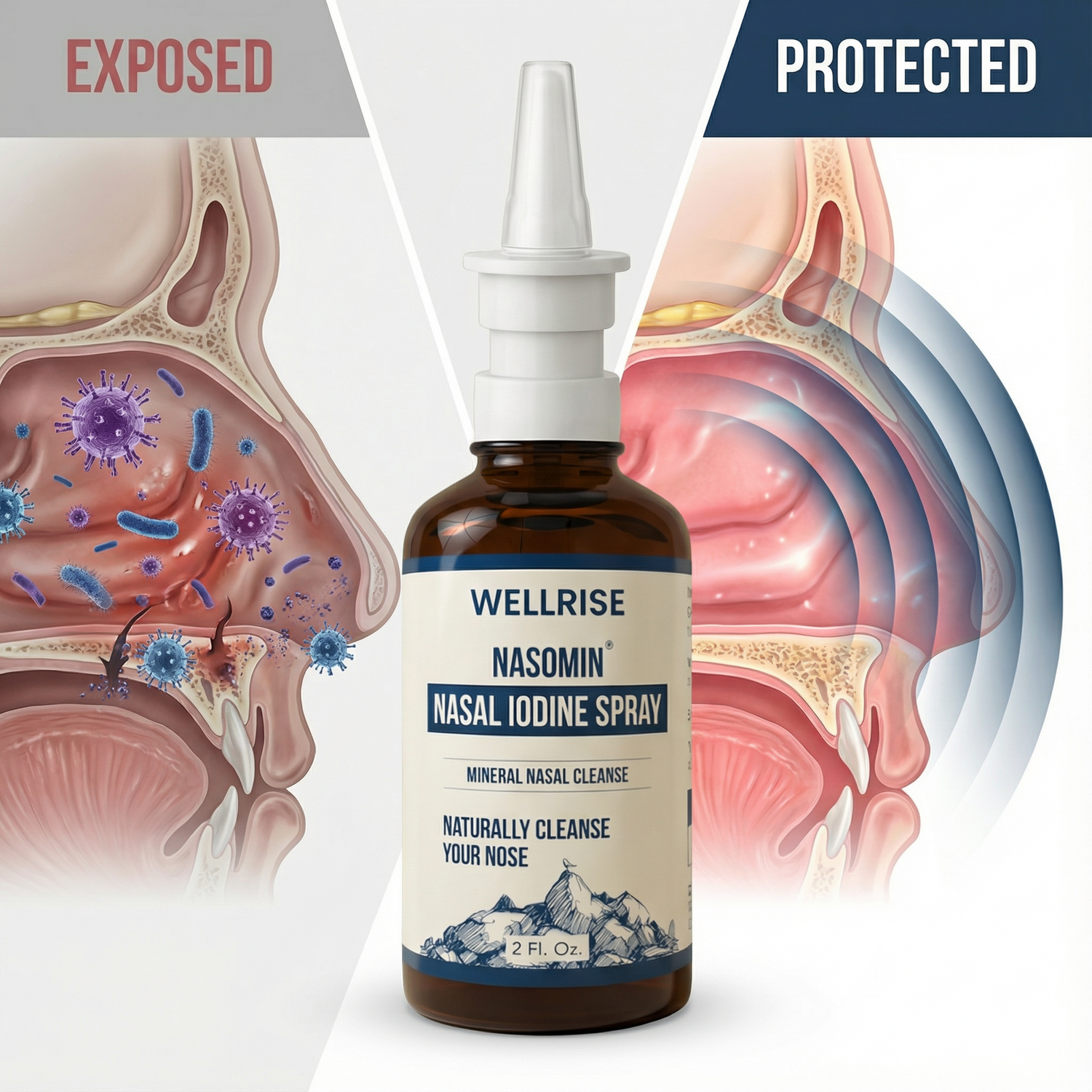 Most germs enter through your nasal passages. WellRise Nasomin delivers a powerful 1% iodine and fulvic acid formula that neutralizes 99% of germs within 90 seconds - protecting you before illness starts. Use it after flights, in crowded spaces, or as part of your daily wellness routine.